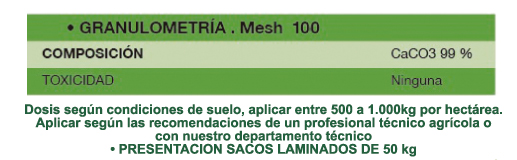 Es un mineral fundamental en el manejo eficiente de cualquier cultivo intensivo ya que ademâs a aportar calcio de lenta liberación regula el pH que es en la actualidad un factor limitante, el Carbonato de Calcio es considerado como la mejor prâctica para manejo de suelos âcidos.